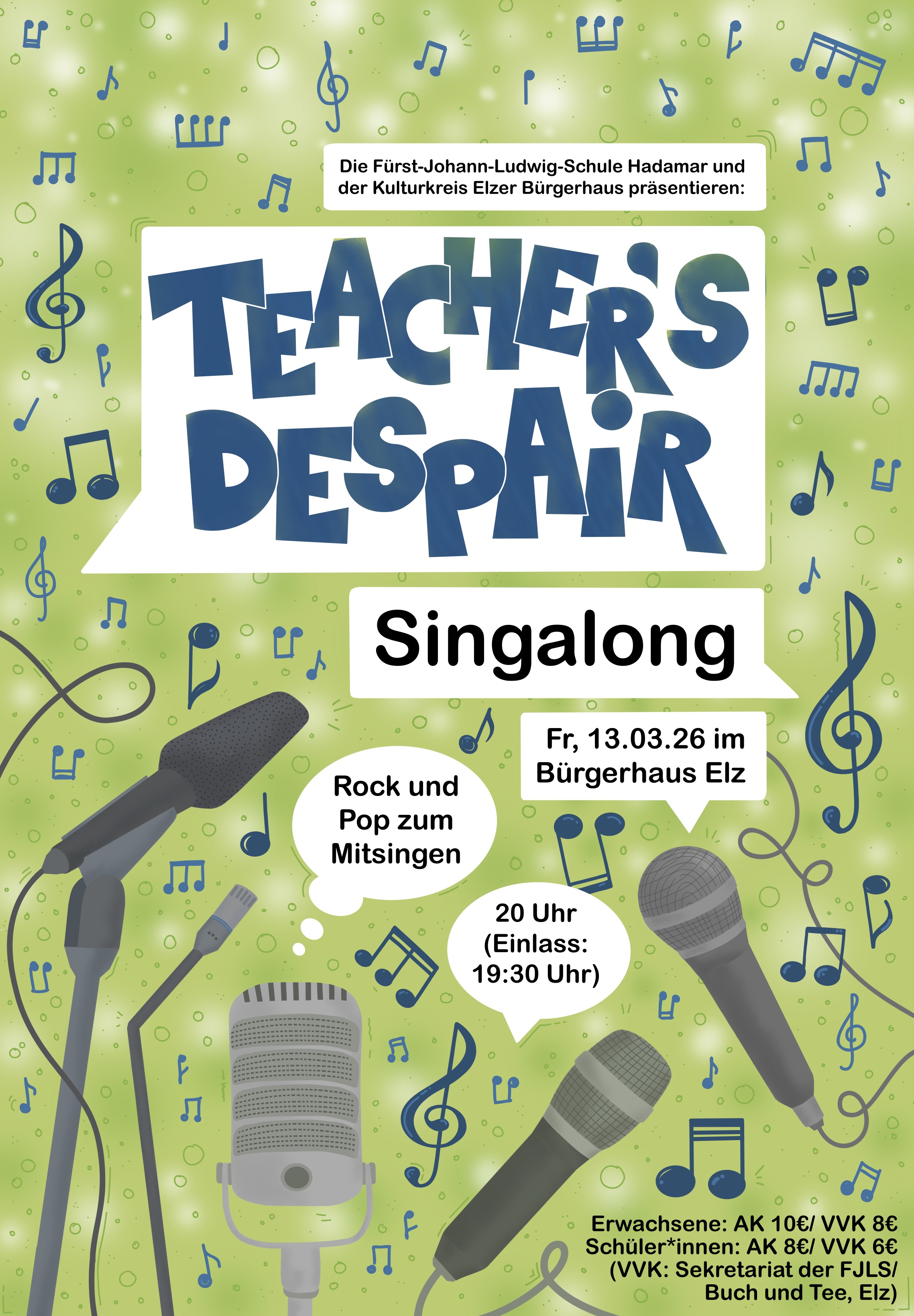 Unter dem Motto „Singalong!“ präsentieren die Schulband „Teacher's Despair“ der Hadamarer Fürst-Johann-Ludwig-Schule und der „Kulturkreis Elzer Bürgerhaus“ am Freitag, dem 13.3. im Elzer Bürgerhaus ein Konzert mit Songs aus Rock und Pop. Zum ersten Mal in der Bandgeschichte ist ein Programmteil so gestaltet, dass das Publikum zum Mitsingen eingeladen ist. Dazu werden die Songtexte projiziert, wie man es von Karaoke-Veranstaltungen kennt. Songs von Queen, Coldplay, Alphaville, Billy Joel und Toto werden im typischen Sound von Teacher´s Despair erklingen, bei dem die Gesangsstimmen der Sängerinnen und Sänger von einer großen Bandbesetzung mit 8 Bläsern (Trompeten, Saxophone und Posaune) begleitet werden.